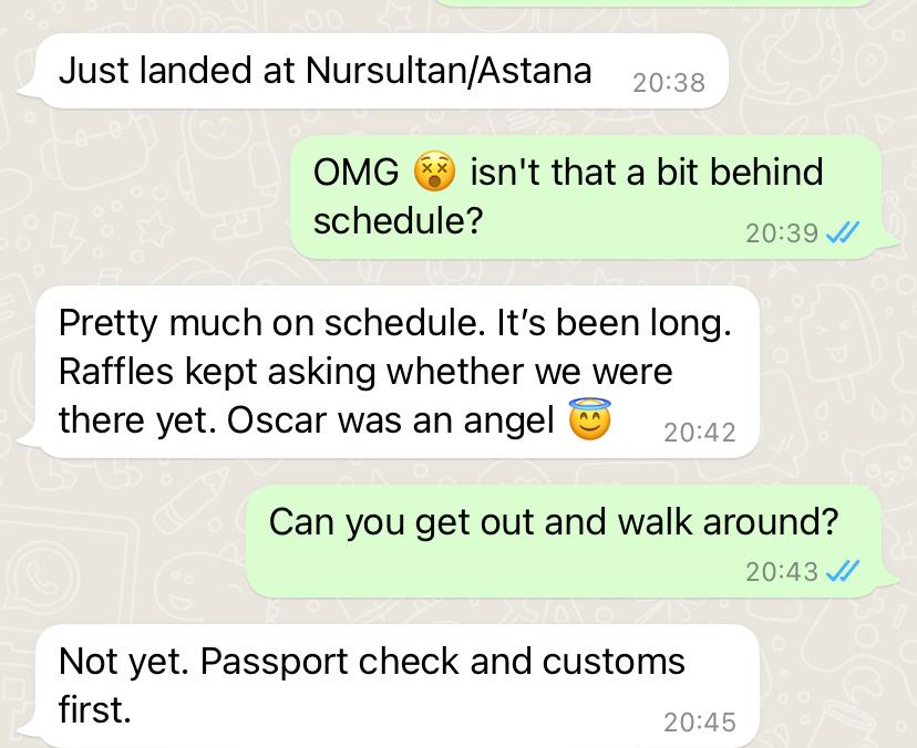 It was a flight distinctly lacking in glamour, Champagne or culinary delicacies. The 16 hour flight, with an hour of refuelling in Kazakhstan, was punctuated by rice and egg and a sandwich; one of the two shouty chihuahuas on board bit the cabin crew even before take off and yelled at the poor rescue dog standing terrified all the way every time he moved. It’s not something I’d repeat. Our Raffles panted and scratched his crate all the way but old Oscar was patient and calm. They were so happy to relieve themselves finally on British grass once we’d cleared our formalities onboard.