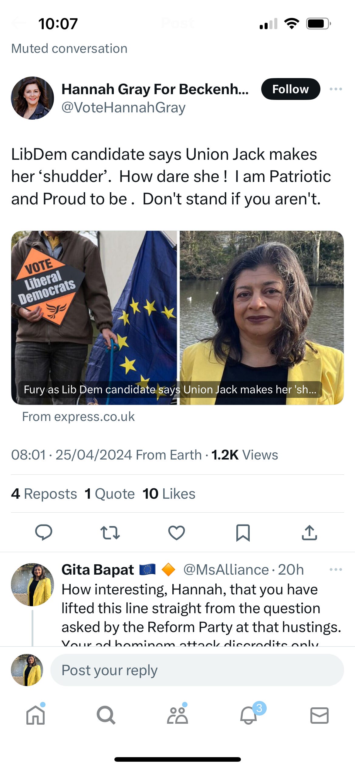 Beckenham has been a Conservative seat since time immemorial but due to boundary changes is one of the Labour Party's target seats for the next General Election. Just before I was confirmed as the Liberal Democrat candidate for the Shortlands council by-election seat, and a few hours before my official acceptance as London Assembly Constituency candidate for Bexley&Bromley, this leaflet from Labour came through the door. We looked at it and John said "That looks like it comes from the Reform Party." So, foolishly in hindsight, I tweeted what he said. Nothing new. I've been quite vocal on the socials in the past how I am now made uncomfortable by the current ubiquity of the Union Flag. It was all over Victoria Station; all over food; all over M&S carrier bags. Politicians now make their public addresses standing next to the Union flag lest they appear insufficiently patriotic. As I said, I've shared this view lots of times and loads of people have publicly agreed with me.