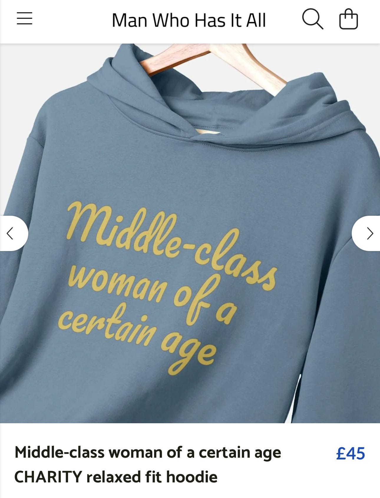 This popped up on my Insta a little while ago. It is, of course, a reference to the recent Gregg Wallace shenanigans. I can say with absolute confidence that I have never been subjected to lewd or sexualised comments by Wallace, in fact as I watch so little TV I have only a vague recollection of what he was in. Slogan merch was inevitable, of course, but I am concerned about which CHARITY benefits from the sale of these hoodies and t shirts. A cursory Google search tells me that they are made by Teemill, which makes sustainable charity apparel for organisations including “the UN and other globally-recognised think tanks,” but it all seems rather too vague to me. I’m also getting a massive ick at the thought of wearing something like this across my copious chest and somehow making light of the damage that sexual harassment does to people. I shan’t be buying one.