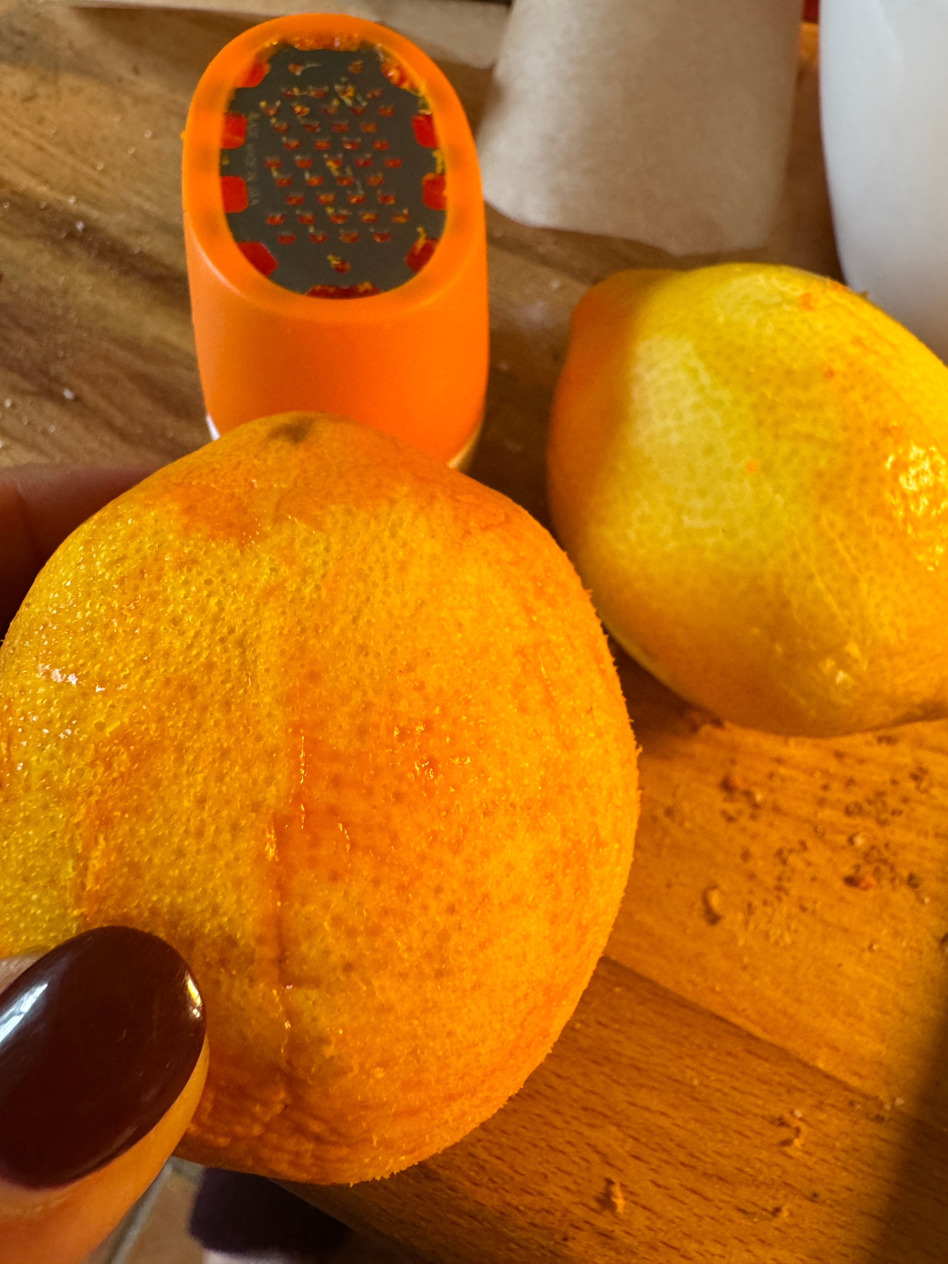 I saw this little gadget in Harts of Stur when I was looking for the now-discontinued individual size 54 pudding basins and it looked like another one of those impulse purchases that languishes forevermore in your middle wossname drawer but, benefit of the doubt as always, I purchased one and I’m so glad I did. It’s a little orange and lemon zester that shaves the good bits off your citrus for cakes or pestos, to be tipped out of that orange silicone holder and straight into your bowl. I’ve had grown-up Microplane and Oxo Good Grips ones before and, don’t get me wrong, I like those but this was the ideal solution for when you don’t want to ruin your manicure. And because the shaving blade is so small, and there’s a stretchy bit of silicone to hold them, your shards of peel1don’t go all over the worktop accompanied by shards of your manicure. It’s a definite plus for me.