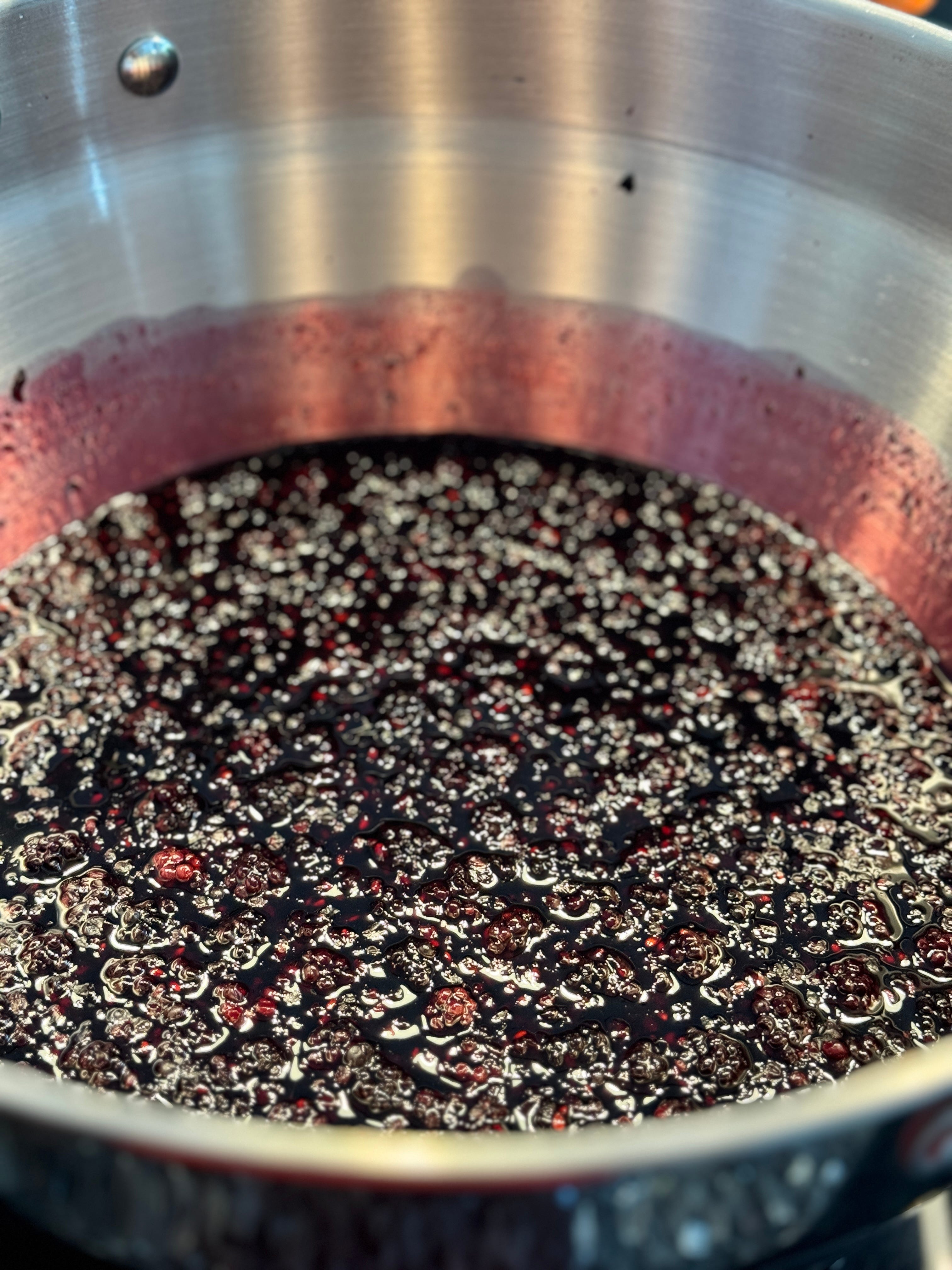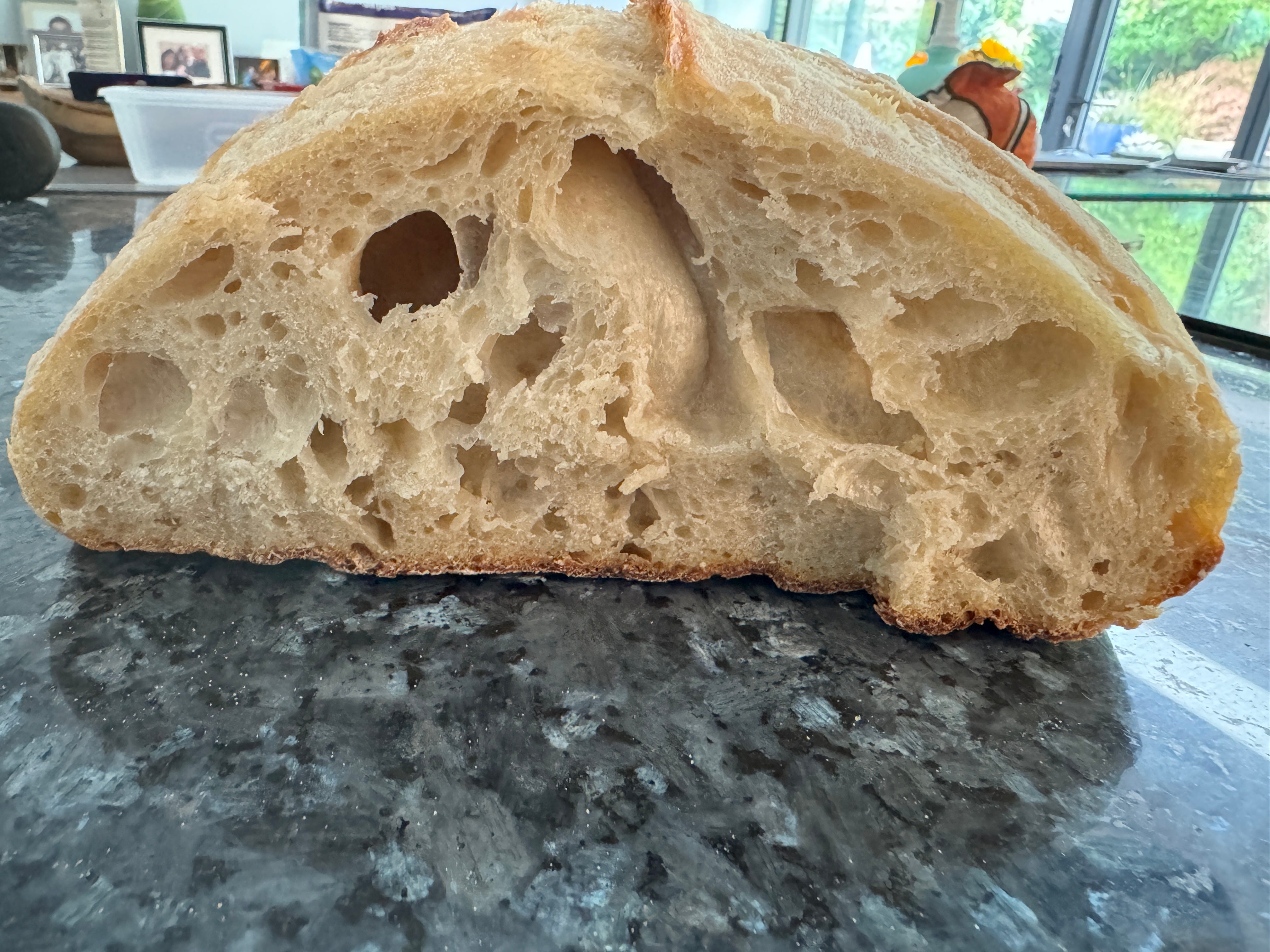 Ironically, no-one in this house eats jam, or didn’t, but this stuff is so good, despite the free added fibre from the unsieved seeds, that we might be about to change that. I achieved a good rise from my latest sourdough, number VII on my Before 60 checklist, and it’s delicious toasted and spread with the purple unctuousness.