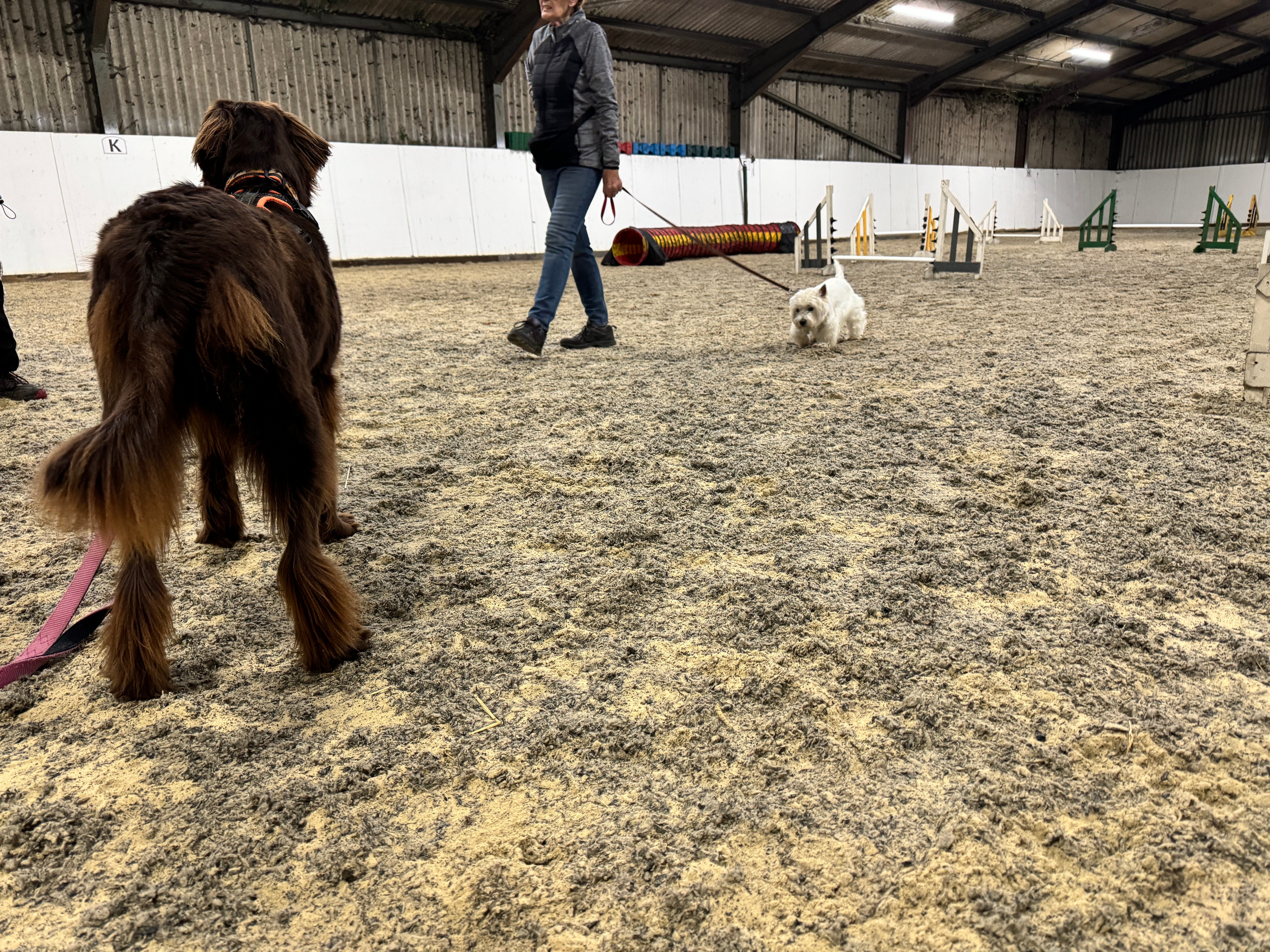 We also tried agility for the first time this week. Fergus had a great time bouncing around over the jumps and cottoned on fairly quickly that he was supposed to jump over the gates and not just sniff and pee on them. He even managed the tunnel with the help of a new blonde bombshell friend. We’ll certainly be going back.