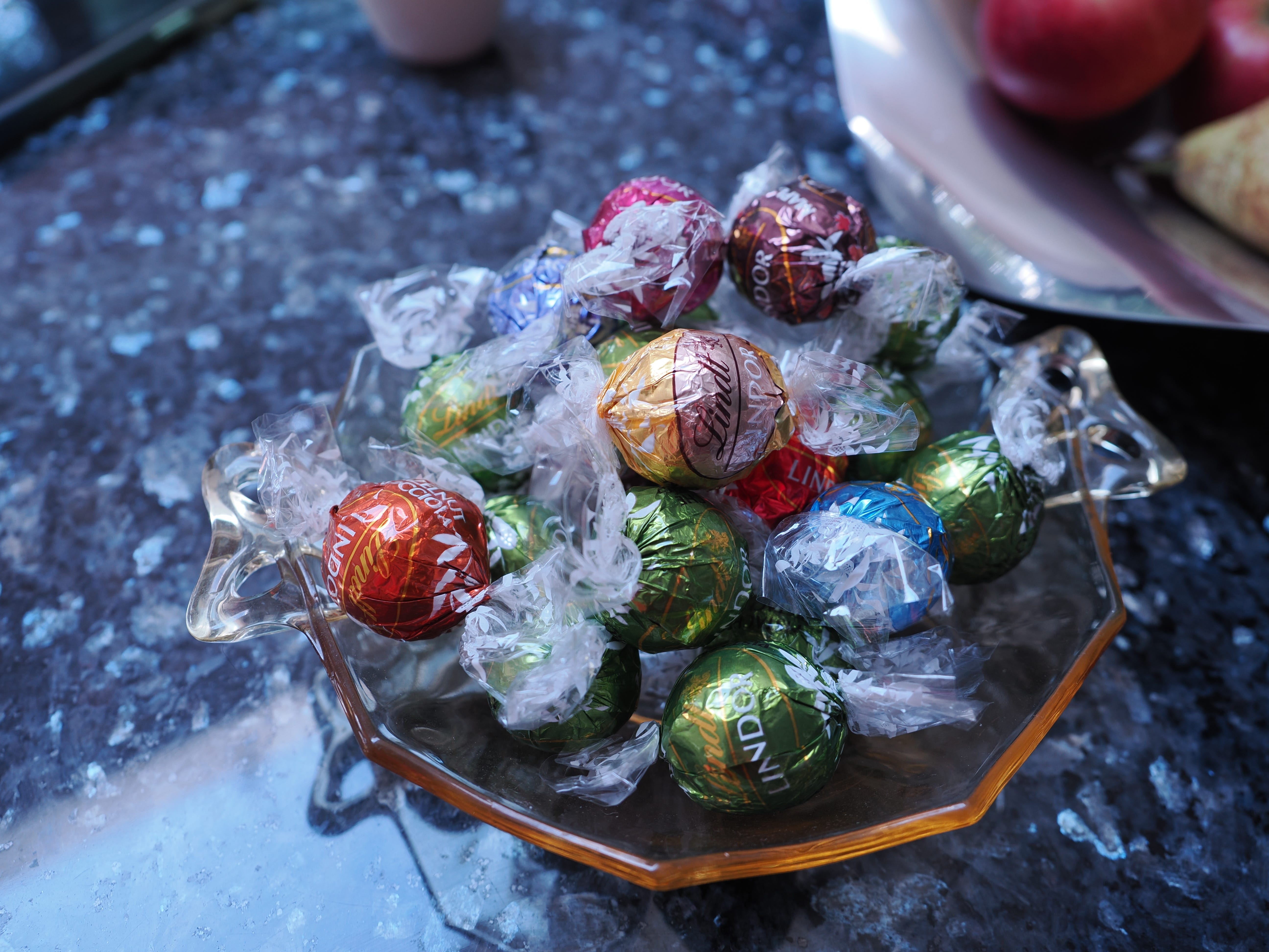 I am now on a break from the diet to eat normally, or incorporating a bit more mindfulness, at least. The plan is to start it again in a few weeks. Naturally, as soon as I started eating more than Jane Plan’s minimal amounts of food, my weight went up and I berated myself for this. In truth, though, after a week I’ve gained only a few hundred grams notwithstanding this present of Lindor balls brought from Montreal by J and G. My favourites are the pistachio cream.